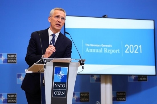 2022年3月31日,在比利時(shí)布魯塞爾,北約秘書(shū)長(zhǎng)斯托爾滕貝格在新聞發(fā)布會(huì)上講話(huà)。新華社記者鄭煥松攝