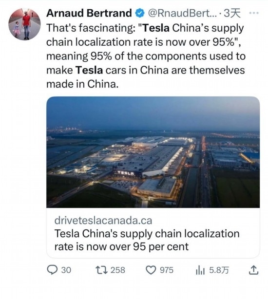 貝特朗還常為中國發(fā)展“點贊”。他在轉發(fā)特斯拉上海超級工廠新聞時由衷贊嘆:“真是太厲害了,這表示在中國生產(chǎn)特斯拉汽車所用的95%的零部件都是中國制造。”(參與記者:陳紹華、張曼;視頻:淡然、王沛;編輯:魯豫、王豐豐、杜逾舸、孫浩)