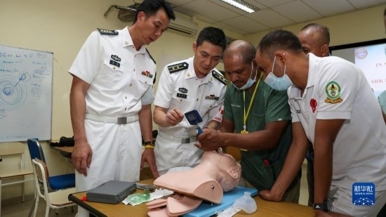 中國海軍“和平方舟”號醫(yī)院船派出醫(yī)療專家分隊赴東帝汶國立醫(yī)院進行ACLS培訓(xùn),醫(yī)院船醫(yī)療專家為當(dāng)?shù)蒯t(yī)護人員進行實操講解(9月5日攝)。新華社記者 黎云 攝
