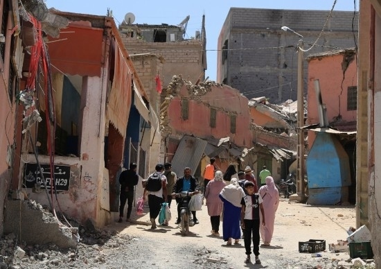 9月10日,在摩洛哥震中附近的艾米茲米茲村,人們從受損建筑旁經(jīng)過(guò)。新華社記者王東震攝
