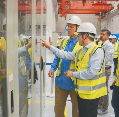 巴基斯坦卡洛特水電站是中巴經(jīng)濟走廊首個水電投資項目,由中國三峽集團投資開發(fā)建設(shè),運營一年來節(jié)約標準煤約140萬噸,減少二氧化碳排放約350萬噸。圖為中方技術(shù)人員向來訪的巴基斯坦代表團介紹水電站運行情況。本報巴基斯坦分社 薩義德·邁赫迪攝