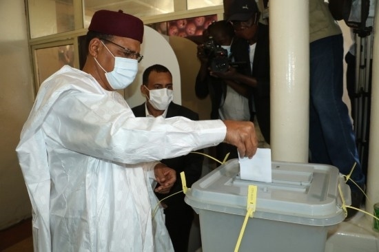 2021年2月21日,尼日爾爭取民主和社會(huì)主義黨候選人穆罕默德·巴祖姆(前)在尼亞美的一處投票站投票。新華社發(fā)