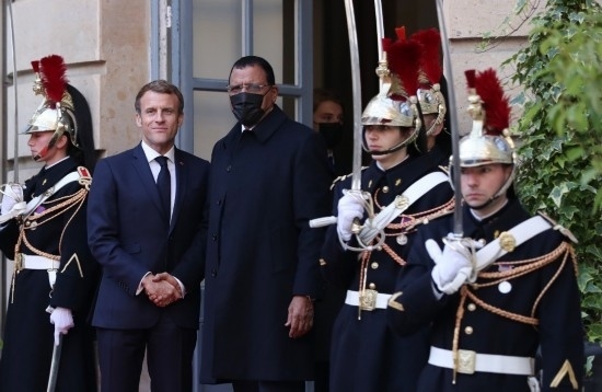 2021年11月12日,在位于法國巴黎的峰會(huì)會(huì)場,法國總統(tǒng)馬克龍(左二)歡迎尼日爾總統(tǒng)巴祖姆(左三)。新華社記者高靜攝