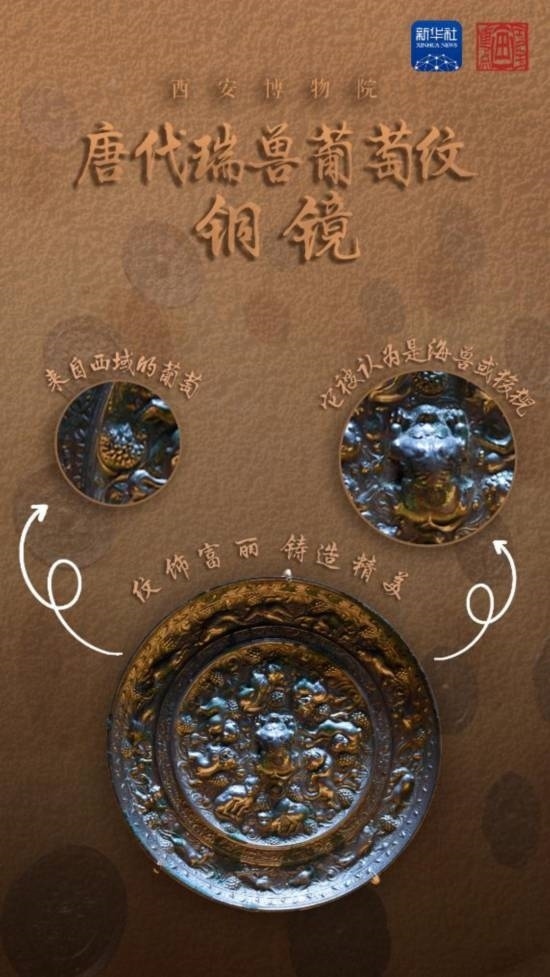 在唐代,我國銅鏡制作和使用進(jìn)入繁盛時期,許多通過絲綢之路傳來的紋樣被工匠應(yīng)用在銅鏡上。瑞獸葡萄紋銅鏡紋飾富麗、鑄造精美,備受當(dāng)時民眾的青睞。瑞獸葡萄紋銅鏡將裝飾藝術(shù)和現(xiàn)實(shí)生活緊密結(jié)合,瑞獸象征著敏捷與美好,葡萄則象征著豐收充裕和多子多福,呈現(xiàn)出濃郁的盛唐氣象,是我國古代中西方文化交流的代表性產(chǎn)物。