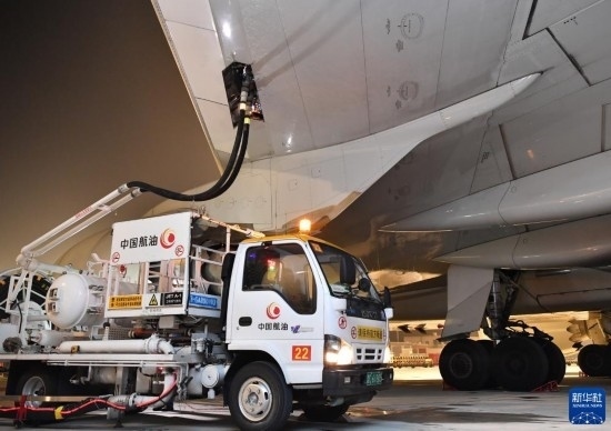 8月1日,在中國鄭州新鄭國際機場,中國航油華南藍天河南分公司的工作人員為一架盧森堡貨航貨機加油。新華社記者 李嘉南 攝