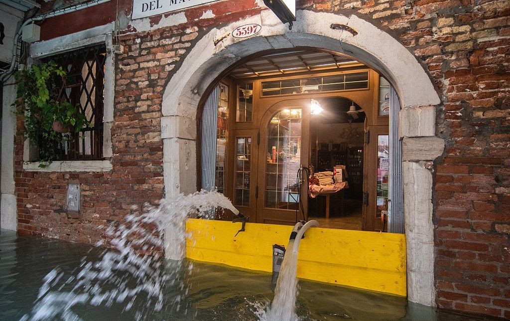 當?shù)貢r間2019年11月17日,意大利威尼斯,當?shù)厮汲掷m(xù)。一家餐廳用水泵排水。