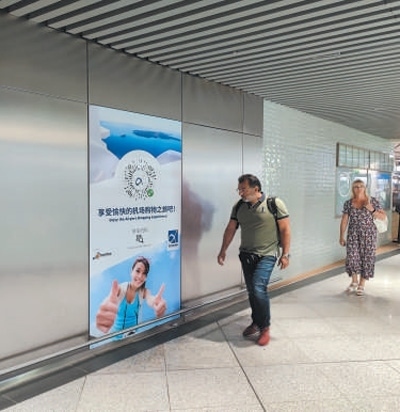 希臘雅典國(guó)際機(jī)場(chǎng)內(nèi),旅客走過(guò)用中文書寫的廣告海報(bào)。本報(bào)記者 謝亞宏攝