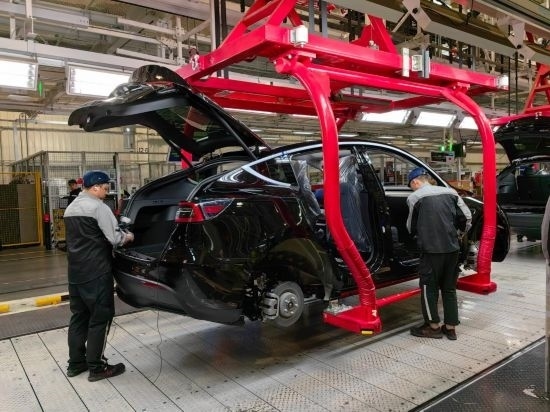 在特斯拉上海超級工廠,工人在車間內忙碌(2月27日攝)。新華社記者 周蕊 攝
