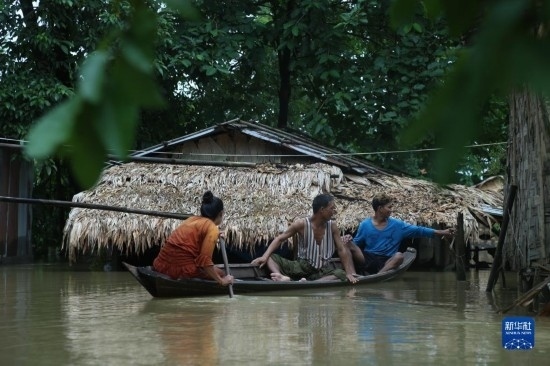 8月12日,在緬甸勃固鎮(zhèn)洪災(zāi)區(qū),人們乘船出行。新華社發(fā)(苗覺(jué)梭攝)