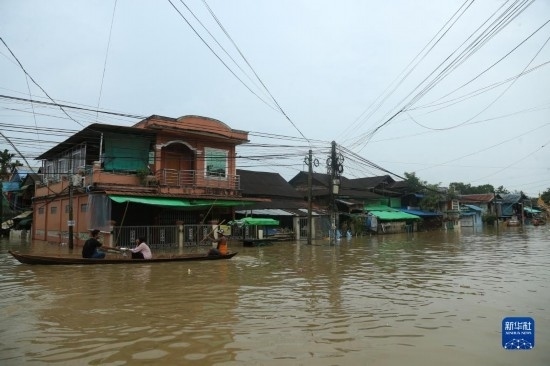 這是8月12日拍攝的緬甸勃固鎮(zhèn)洪災(zāi)區(qū)。新華社發(fā)(苗覺(jué)梭攝)