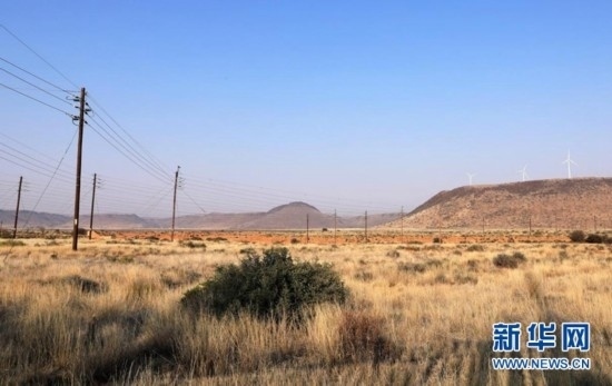 這是8月10日在南非北開(kāi)普省德阿鎮(zhèn)拍攝的龍?jiān)茨戏枪镜掳L(fēng)電項(xiàng)目風(fēng)機(jī)和輸電線路。 新華社記者 董江輝 攝