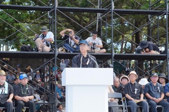 2016年6月19日,在日本沖繩縣首府那霸市一座公園內(nèi),時任沖繩縣知事翁長雄志(前)發(fā)表講話。新華社記者沈紅輝攝