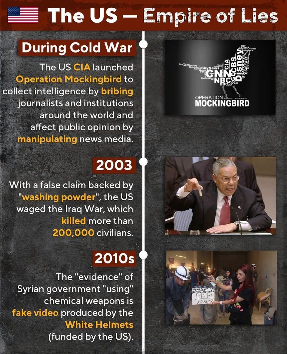 早在冷戰(zhàn)期間,美國中央情報局發(fā)起了“知更鳥計劃”,通過賄賂世界各地的記者和機構(gòu)來收集情報,并通過操縱新聞媒體來影響公眾輿論。新世紀借“洗衣粉”“白頭盔”,美國對伊拉克、敘利亞悍然發(fā)動侵略戰(zhàn)爭,造成數(shù)十萬平民死亡。