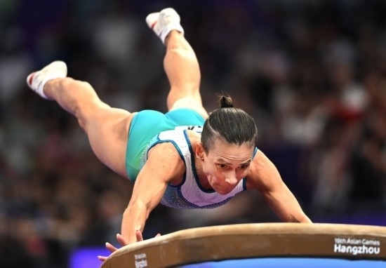 9月28日,烏茲別克斯坦選手奧克薩娜·丘索維金娜在杭州亞運(yùn)會(huì)競(jìng)技體操項(xiàng)目女子跳馬決賽中,最終她獲得第四名。新華社記者 程敏 攝