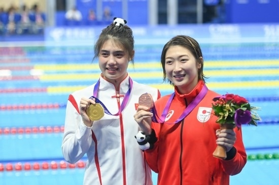 9月29日,冠軍中國(guó)選手張雨霏(左)和季軍日本選手池江璃花子在杭州亞運(yùn)會(huì)游泳項(xiàng)目女子50米蝶泳頒獎(jiǎng)儀式后。新華社記者 黃宗治 攝