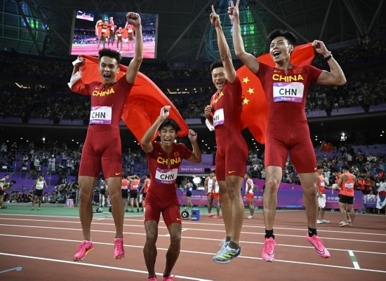 10月3日,中國(guó)選手陳冠鋒、謝震業(yè)、陳佳鵬、嚴(yán)海濱(從右至左)慶祝奪得杭州亞運(yùn)會(huì)田徑項(xiàng)目男子4x100米接力冠軍。新華社記者 宋彥樺 攝
