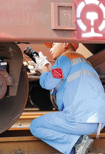 在鄭州北站,一名工人正對車底進(jìn)行檢修。本報記者 何嘉豪攝