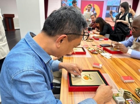 嘉賓在中國(guó)工藝集團(tuán)體驗(yàn)景泰藍(lán)制作過(guò)程 (新華社記者王艷剛攝)
