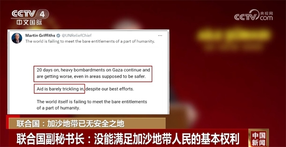 同一天,聯(lián)合國分管人道主義事務(wù)的副秘書長馬丁·格里菲斯在社交媒體發(fā)文稱,在過去20天里,對加沙地帶的猛烈轟炸愈發(fā)嚴(yán)重,一些本該安全的地區(qū)也已經(jīng)陷入危險,但援助物資卻很難進入加沙地帶,國際社會沒能滿足一部分人的基本權(quán)利。
