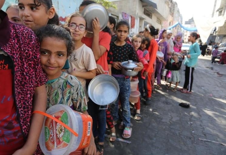 11月9日,在加沙地帶南部城市拉法,人們在一個(gè)臨時(shí)分發(fā)點(diǎn)排隊(duì)領(lǐng)取食物。新華社發(fā)(哈立德·奧馬爾攝)