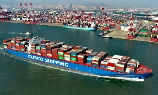 2021年2月19日,在位于山東自貿(mào)試驗區(qū)青島片區(qū)的山東港口青島港前灣集裝箱碼頭,一艘滿載集裝箱的貨輪駛出港口。