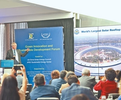 當(dāng)?shù)貢r(shí)間11月13日,由亞太經(jīng)合組織可持續(xù)能源中心和美中綠色能源促進(jìn)會(huì)共同主辦的“綠色創(chuàng)新與可持續(xù)發(fā)展論壇”在舊金山舉行,與會(huì)嘉賓就清潔能源、綠色發(fā)展、共同應(yīng)對(duì)氣候變化等議題交流研討。本報(bào)北美中心分社 伊芙莉·妮可·梅菲爾德攝