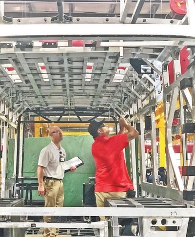 在位于美國(guó)加州蘭卡斯特市的比亞迪大巴工廠里,工作人員正在檢查設(shè)備。郜夢(mèng)日攝