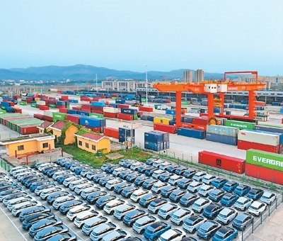11月28日,在位于江西省贛州市南康區(qū)的贛州國際陸港,比亞迪新能源汽車將通過鐵路運(yùn)送至深圳鹽田港出口國外。