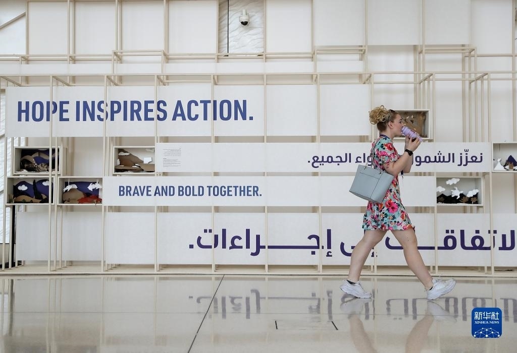 12月12日,在阿聯(lián)酋迪拜,一名女子走在聯(lián)合國氣候變化迪拜大會(huì)會(huì)場內(nèi)。新華社記者 王東震 攝