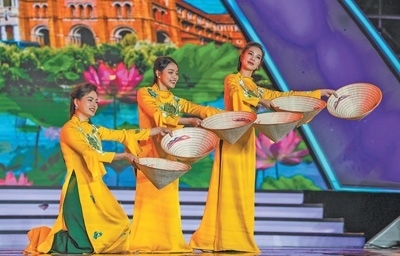 11月30日,2023年瀾滄江·湄公河流域國(guó)家文化藝術(shù)節(jié)開幕式暨文藝晚會(huì)在云南景洪市舉行。圖為來(lái)自越南的藝術(shù)工作者在表演舞蹈《斗笠舞》。新華社記者 胡 超攝