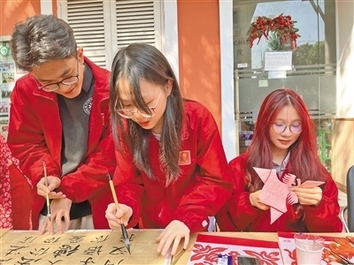 12月8日,在河內(nèi)大學(xué)孔子學(xué)院舉行的文化體驗(yàn)活動(dòng)中,越南大學(xué)生體驗(yàn)中國(guó)書法和剪紙。本報(bào)記者 張遠(yuǎn)南攝