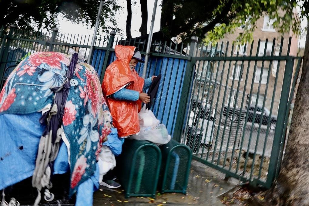 2023年1月10日,一名無家可歸者冒雨走在美國洛杉磯市中心第六街街頭。新華社發(fā)