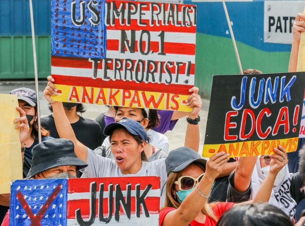 2023年4月11日,在菲律賓首都大馬尼拉地區(qū)奎松城,民眾參加集會(huì)活動(dòng),抗議菲律賓和美國(guó)軍方舉行聯(lián)合軍事演習(xí)。菲律賓和美國(guó)軍方當(dāng)天在菲首都馬尼拉啟動(dòng)為期18天的2023年度“肩并肩”聯(lián)合軍事演習(xí)。新華社發(fā)(烏馬利攝)