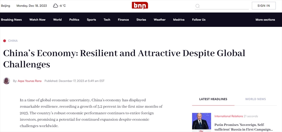 美國新聞網(wǎng)站BNN Breaking報(bào)道認(rèn)為,在全球經(jīng)濟(jì)充滿不確定性的背景下,中國經(jīng)濟(jì)表現(xiàn)出驚人的韌性,2023年前三季增長5.2%。