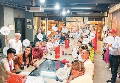 “漢語橋”哥倫比亞教育工作者訪華團組到天津楊柳青古鎮(zhèn)體驗年畫制作。