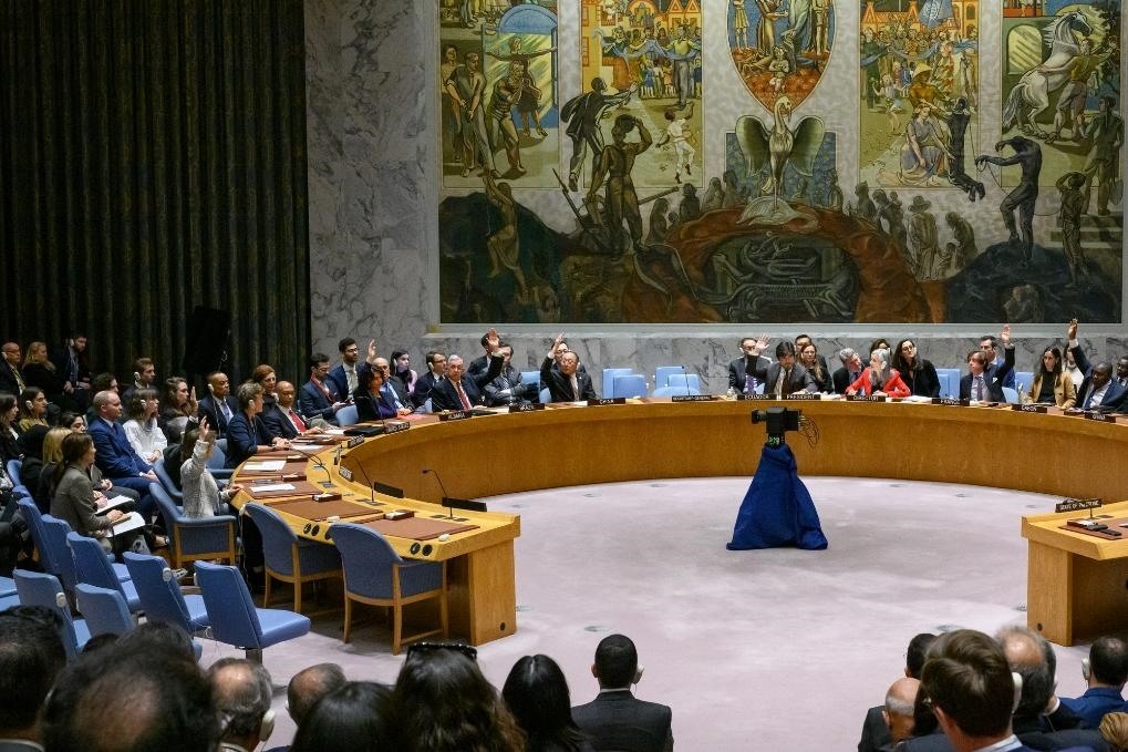 這是12月8日在位于紐約的聯(lián)合國(guó)總部拍攝的聯(lián)合國(guó)安理會(huì)會(huì)議現(xiàn)場(chǎng)。美國(guó)當(dāng)天否決了聯(lián)合國(guó)安理會(huì)一份旨在推動(dòng)實(shí)現(xiàn)巴以人道主義?;鸬臎Q議草案。新華社發(fā)(聯(lián)合國(guó)供圖/洛伊·費(fèi)利佩攝)