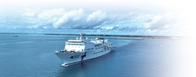 7月22日,正在執(zhí)行“和諧使命—2023”任務的中國海軍“和平方舟”號醫(yī)院船結(jié)束對基里巴斯的訪問駛離塔拉瓦港。桂江波攝(新華社發(fā))