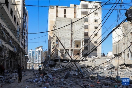 12月24日,在加沙地帶南部城市汗尤尼斯,人們查看以軍襲擊后的受損情況。新華社發(fā)(里澤克·阿卜杜勒賈瓦德攝)pagebreak