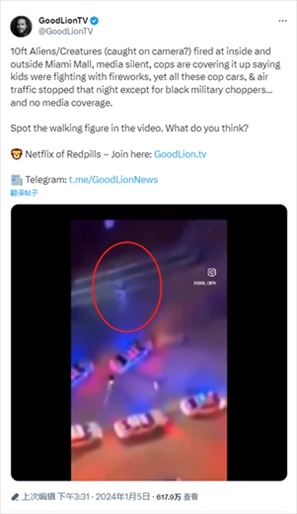 報(bào)道提到,一個(gè)推廣涵蓋科幻、陰謀論等內(nèi)容電影和紀(jì)錄片的X平臺賬號曬出現(xiàn)場視頻稱,“10英尺高的外星人/生物(被攝像機(jī)拍到?)朝邁阿密購物中心內(nèi)外開火,媒體沉默,警察掩蓋說孩子們?nèi)挤艧熁ú⒋蚨?,然而除了黑色軍用直升機(jī),所有警車和空中交通都在那天晚上一動不動……這卻沒有媒體報(bào)道。視頻中出現(xiàn)了行走的身影。你覺得呢?”↓
