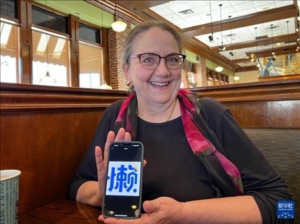 1月9日,在美國得克薩斯州達(dá)拉斯,朱麗葉·托馬斯用手機展示她的微信頭像“懶”字,意在提醒所有人監(jiān)督她學(xué)中文要勤奮,不要偷懶。新華社發(fā)(田丹攝)