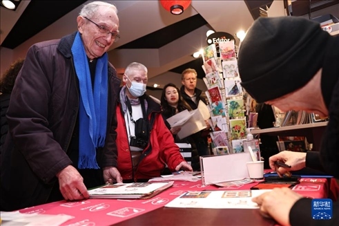 1月26日,在法國巴黎舉行的發(fā)行儀式上,郵票設(shè)計者陳江洪為當?shù)丶]愛好者簽字留念。新華社記者 高靜 攝