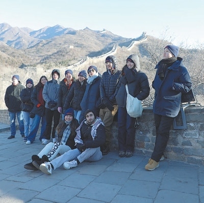1月7日,弗吉尼亞大學(xué)代表團(tuán)成員在八達(dá)嶺長(zhǎng)城合影留念。本報(bào)記者 趙益普攝