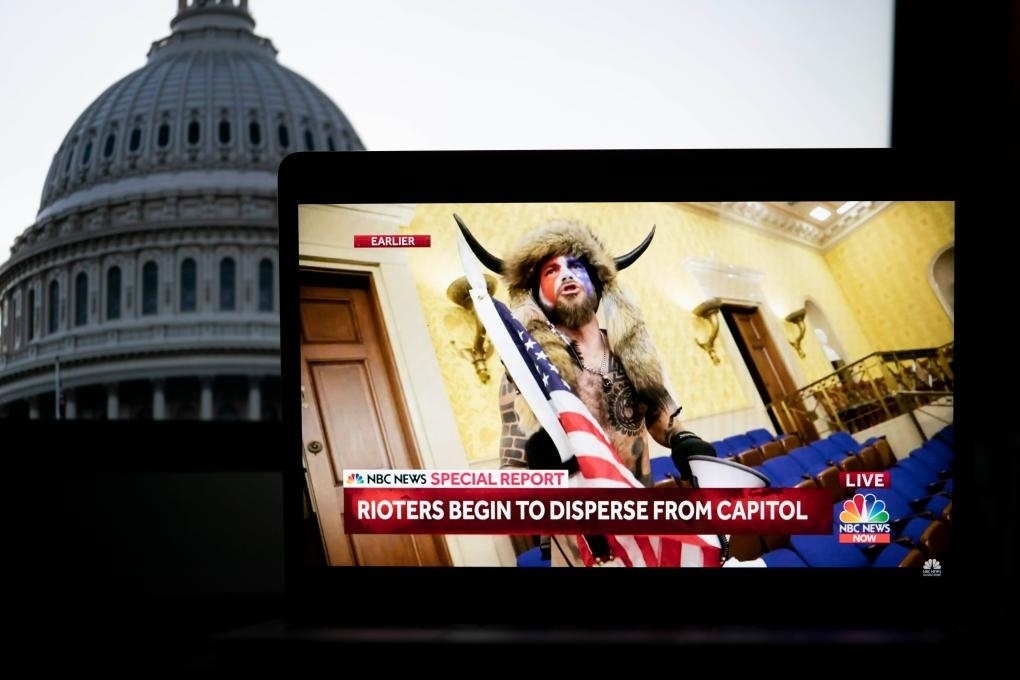 2021年1月6日拍攝的電視畫面顯示,一名抗議者闖入位于美國華盛頓的國會大廈。新華社記者劉杰攝