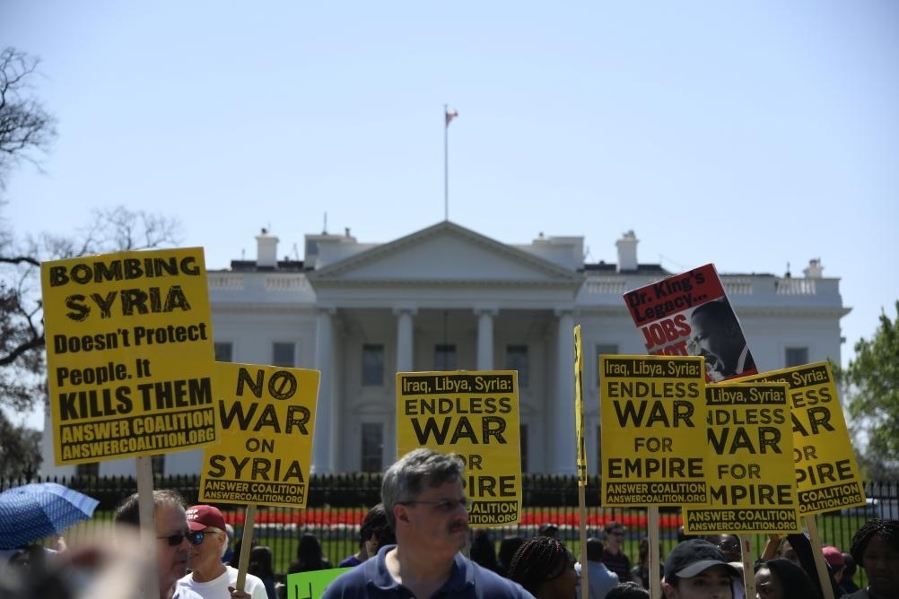 2018年4月14日,在美國華盛頓白宮北側(cè),人們手持標(biāo)語抗議對敘利亞進(jìn)行軍事打擊。新華社記者楊承霖攝
