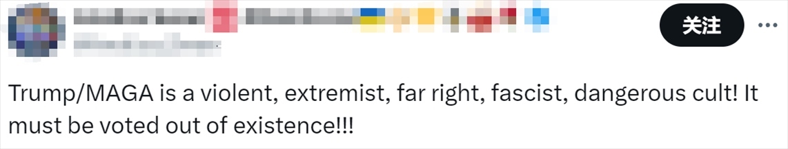 有人喊話:“特朗普/MAGA(即讓美國再次偉大口號)是一個暴力的、極端的、極右翼的、法西斯的、危險的邪教!一定要用投票讓它不復存在!??!”
