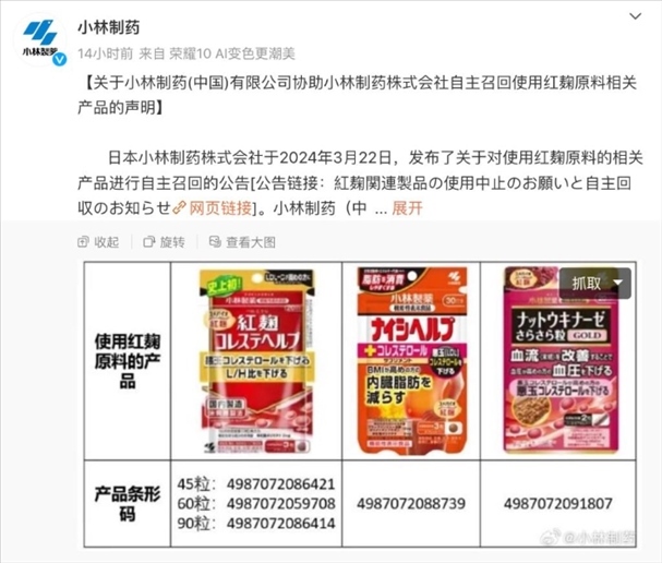 小林制藥22日宣布緊急召回該公司三款含紅曲成分保健品,原因是日本有消費者服用該公司含紅曲成分保健品后出現(xiàn)腎臟疾病等健康問題。該公司稱,出問題的原因可能是產(chǎn)品混入此前“意想不到”的來自霉菌的成分,但尚未弄清該成分究竟是什么。