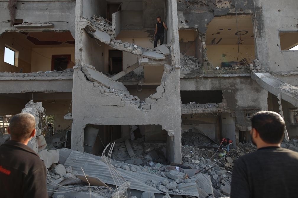 ?4月2日,在加沙地帶中部城市代爾拜拉赫,人們查看被以軍空襲后的建筑。新華社發(fā)