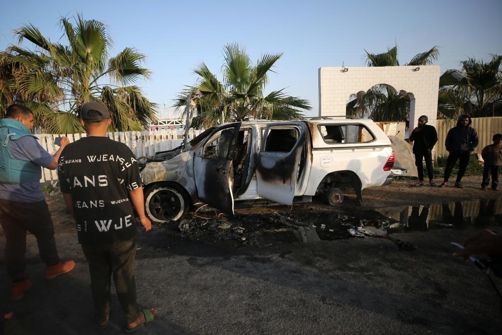 ?4月2日,在加沙地帶中部代爾拜拉赫,巴勒斯坦人在空襲過后查看被毀的汽車。巴勒斯坦紅新月會(huì)2日發(fā)表聲明說,以色列軍隊(duì)1日晚空襲加沙地帶中部城市代爾拜拉赫,造成慈善組織“世界中央廚房”7名工作人員死亡。新華社發(fā)(亞西爾·庫(kù)迪攝)