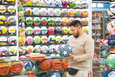 浙江省義烏國(guó)際商貿(mào)城,來自厄瓜多爾的外商在選購(gòu)球類。時(shí)寬兵攝(人民視覺)