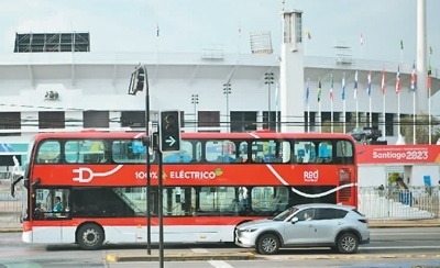 在智利首都圣地亞哥,一輛520路新能源公交車經(jīng)過2023泛美運動會主場館。新華社記者 辛悅衛(wèi)攝